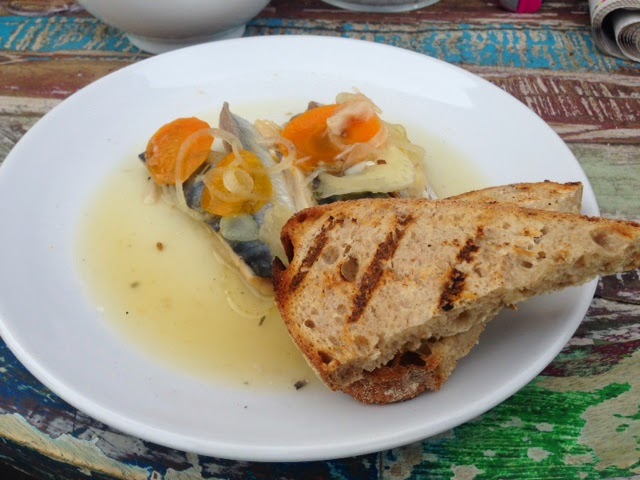 The Sunday lunch menu, reassuringly small with delicious sounding dishes such as sugar cured venison, smoked halibut with grapefruit and chili had me heading instantly for the mackerel escabeche. My companion, a big fan of roasts on a Sunday ordered the free range chicken and to wash it down a small carafe of a Provence Rosé.