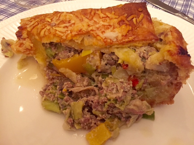 Spoon the mix over the pastry base. Spread evenly and cover with another pastry sheet and finally sprinkle over the cheese.