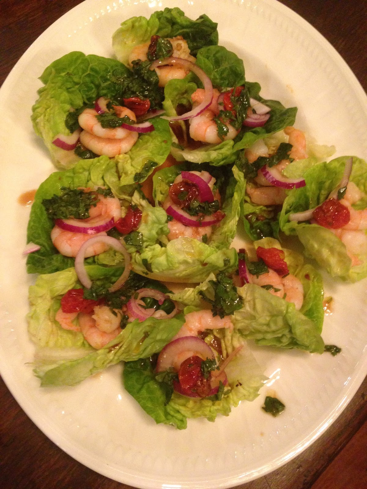I served these at a canape party where people inelegantly grabbed a lettuce leaf and opened wide. They can of course be served as a first course and make a refreshing change from the usual prawn dishes that are a little stale, in my opinion.